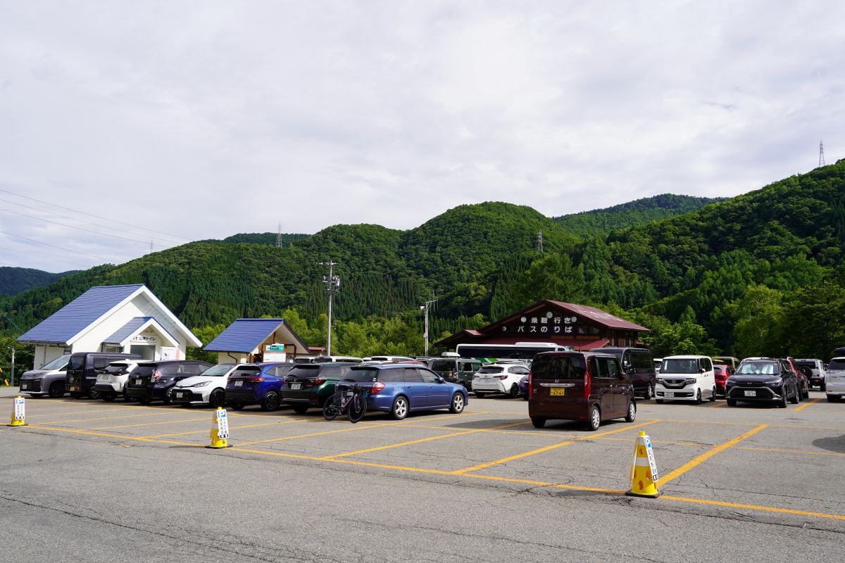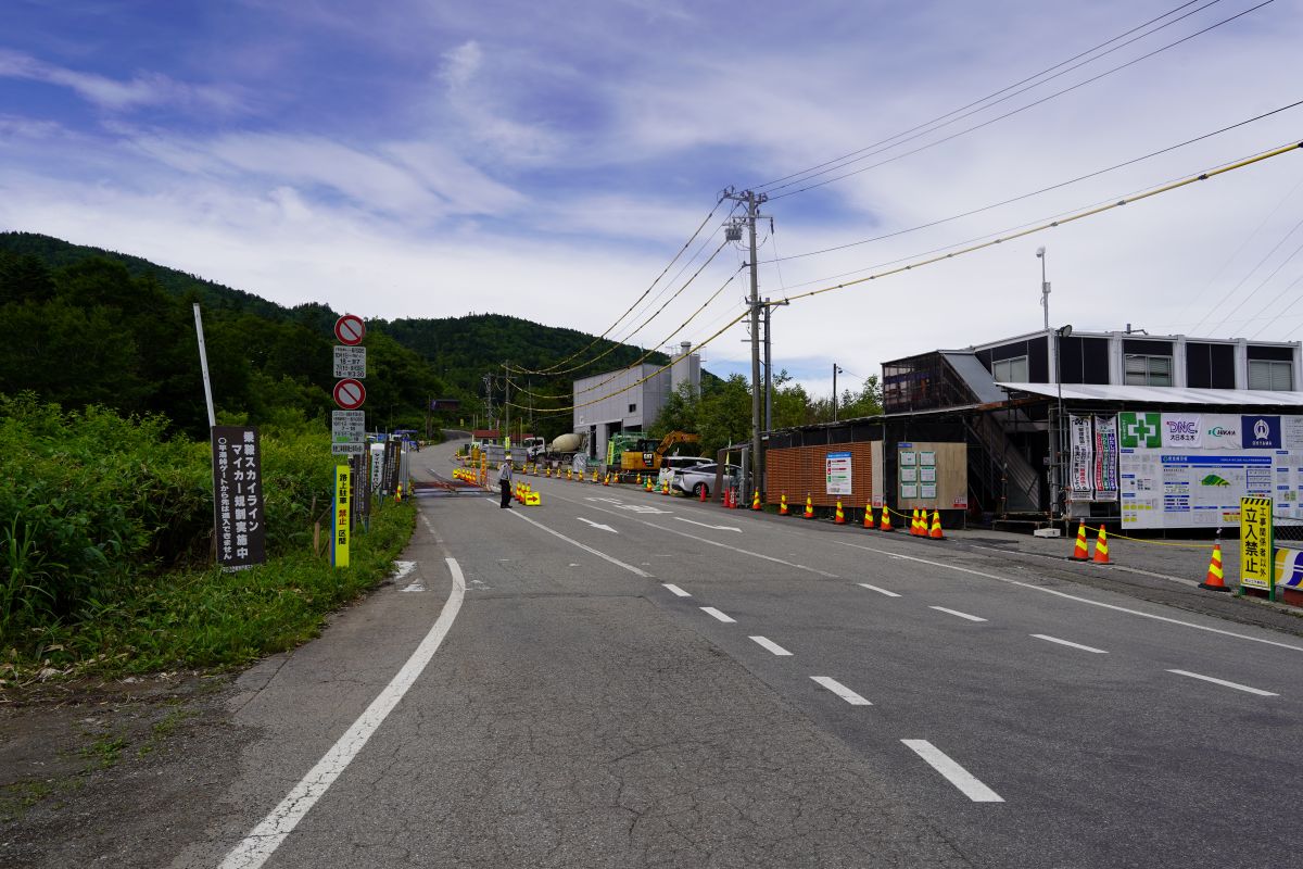 いろんな資料を見ると、この平湯峠にクルマを停めてスタートできると書いてあるのですが、2025年7月時点で、その駐車場には工事事務所やコンクリ工場が建っていて利用できない状態でした。