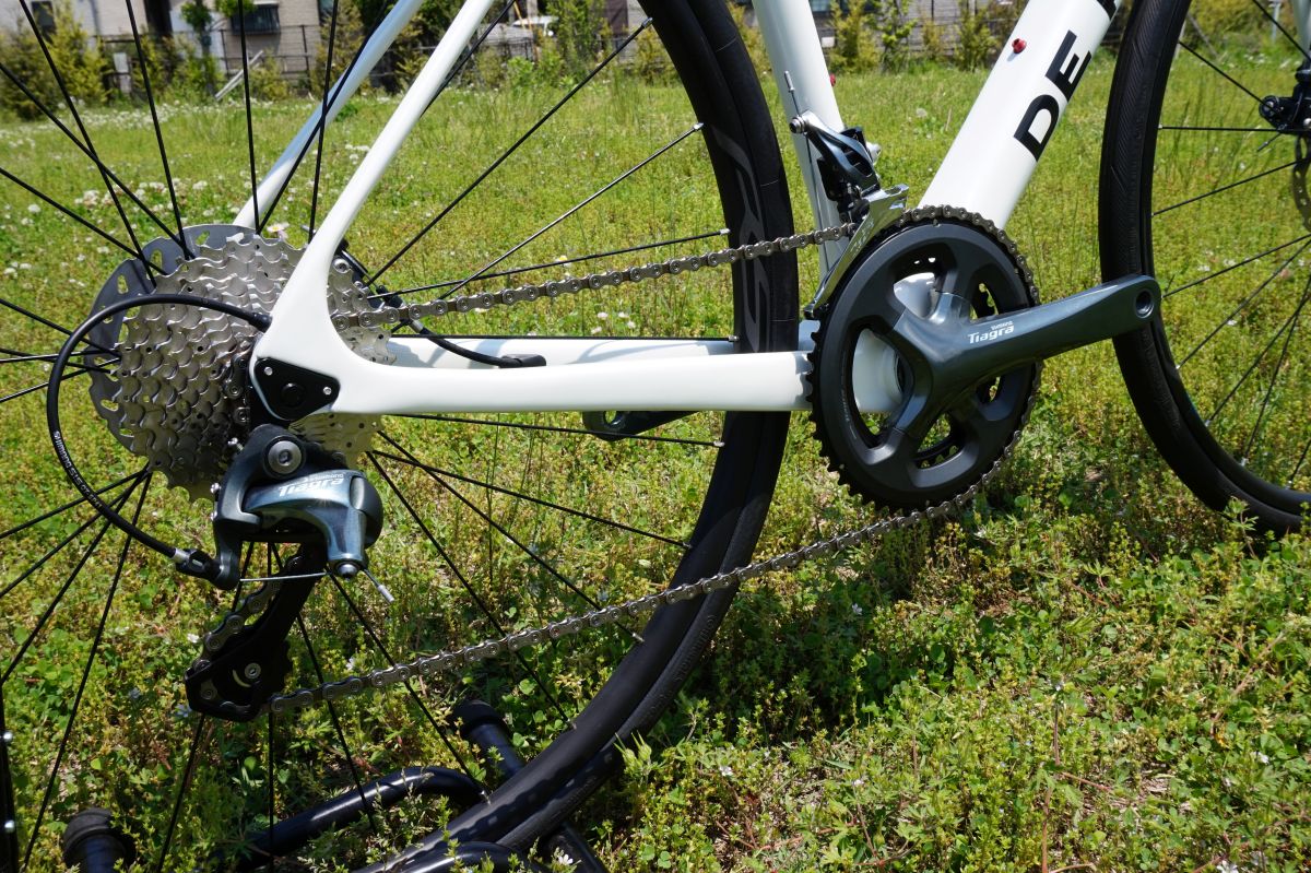 メインコンポーネントはシマノTIAGRAフラットバー。このコンポーネント、巷の評価はだいぶ低いように感じるのですが、ロングライド目的で考えるとバランスのよい製品です。アイスグレーなパーツの色も唯一無二感があります。