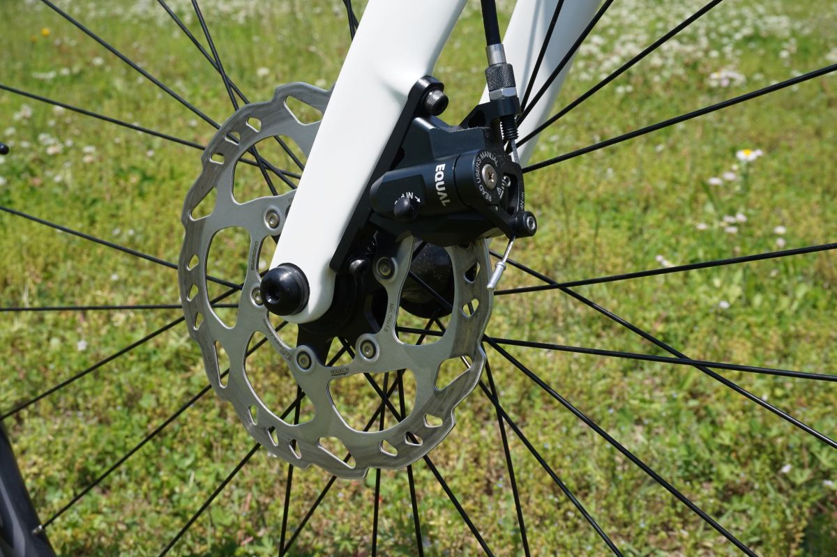 ブレーキレバーがワイヤー引きなので、ブレーキキャリパーも機械式。ですが、機械式のなかでは引きの良さなど性能に定評があるEQUALを使わせていただいています。