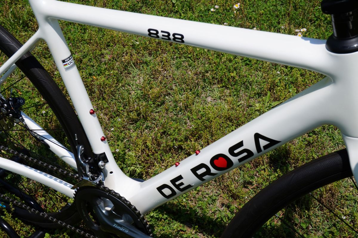 白地に黒ロゴ、赤いハートマークのデローザって、イメージ的には標準的な感じがするのですが、意外にも838にはこの色の設定がなく、ワイズロードが別注したものが今回のフレームです。おかげさまでこのフレームも残り本数僅か(サイズはいずれも大きめ)となっています。