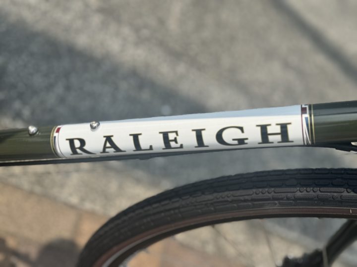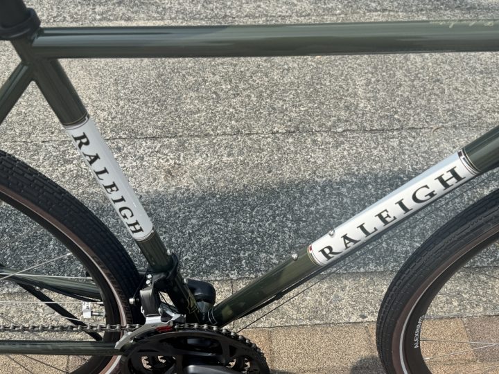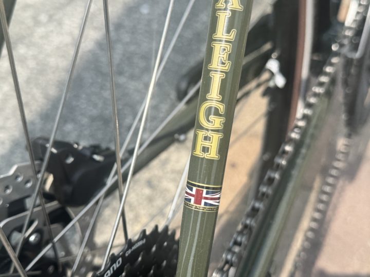 ヘッドチューブの紋章みたいなのも古き英国な感じですが、このロゴの帯もよく見ると両端にユニオンジャックラインが入ってます。
