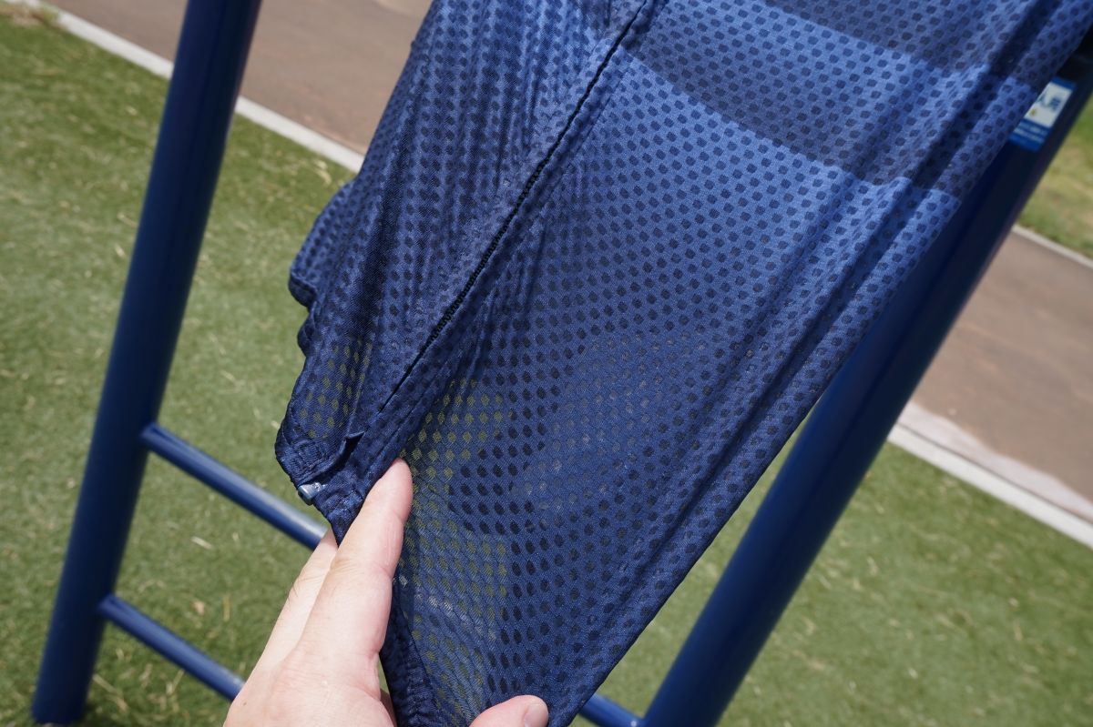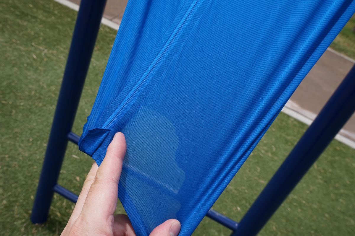 前身ごろは薄手のメッシュ。汗を放出しやすく、通気性に優れた素材で、いつでも涼しいので前ファスナーは閉じたままでも問題なし。ただ生地が薄いので透けるのと、涼感スプレーなどの効果が薄い(生地に留まらないので)という点があります。