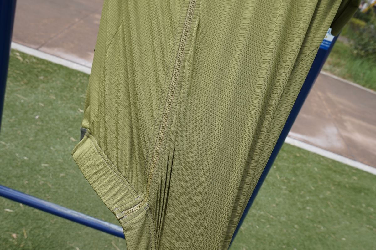 伸縮性があり、体の動きによく追従してくれます。伸びたうえで、ピタっとする感じ。筋肉をサポートするほどではないですが、それに近い印象を受けます。裾は背中側だけグリッパーがあるので、前を大きく開いてもバタバタしにくくなっています。
