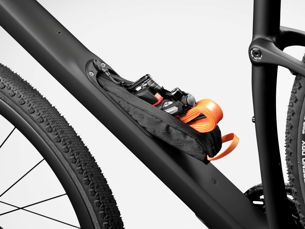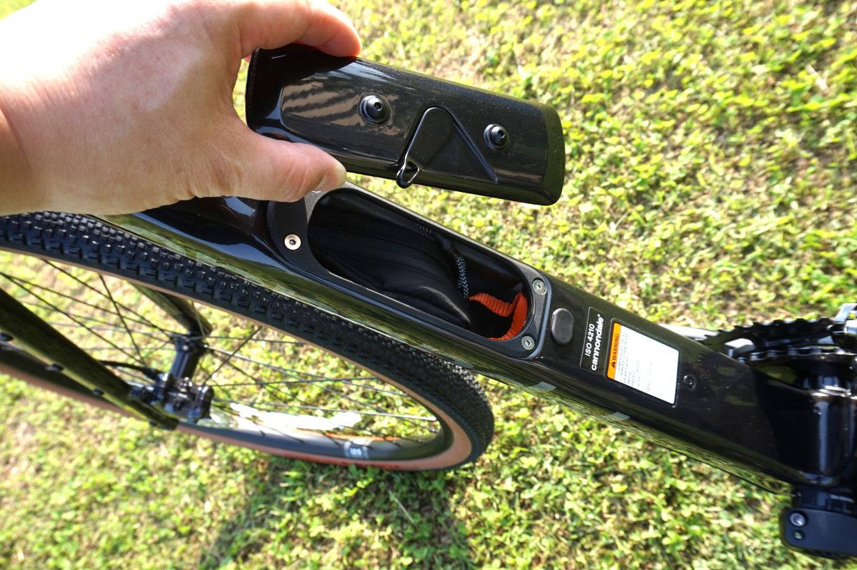 第3世代TOPSTONE CARBONの、いちばん目につきやすいポイントはフレーム内収納に対応したこと!『Stash Port』と呼ばれるこのハッチはダウンチューブのボトルケージ台座部分にあり、開くと内部に収納バッグ『Stash Bag』を内蔵していて、整理して収納が可能になっています。