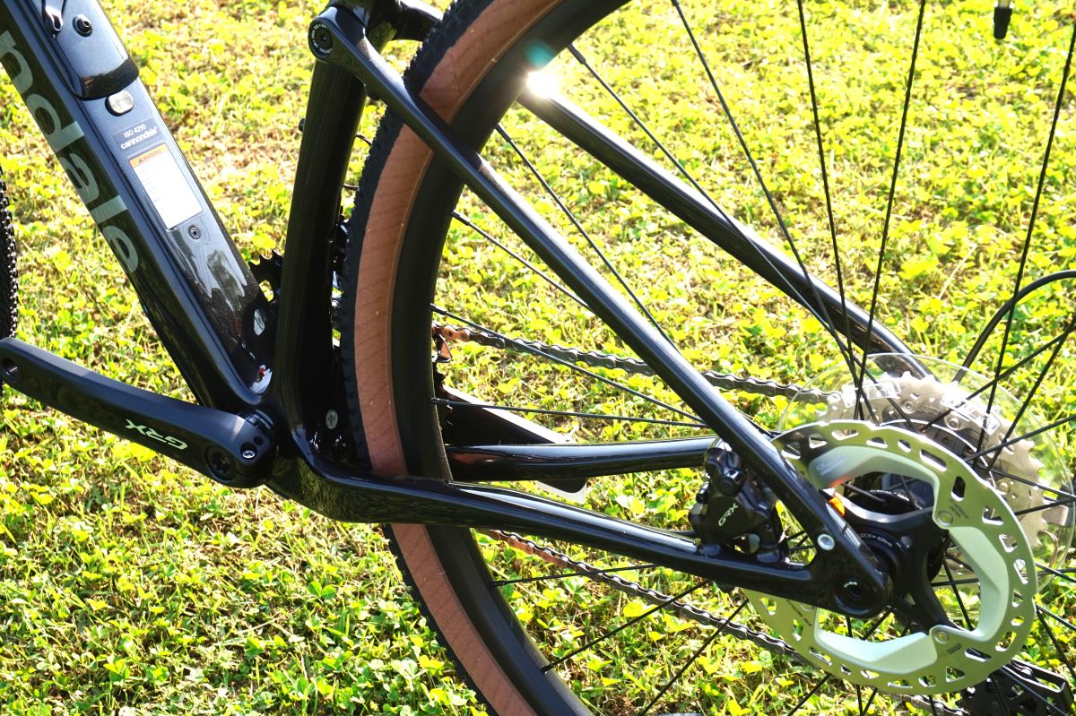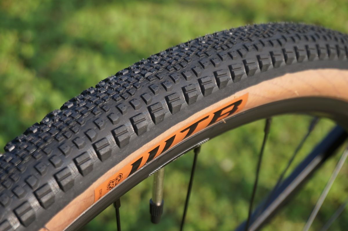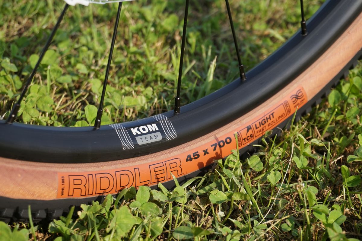 ホイールはWTBのKOM TeamとRIDDLER 700×45Cのセット。標準状態ではチューブが入っていますが、ご注文時にチューブレスをご指定いただくことも可能です。タイヤのパターンは密で、舗装路での抵抗は少ないですが、土のハードパックなどではしっかりグリップします。