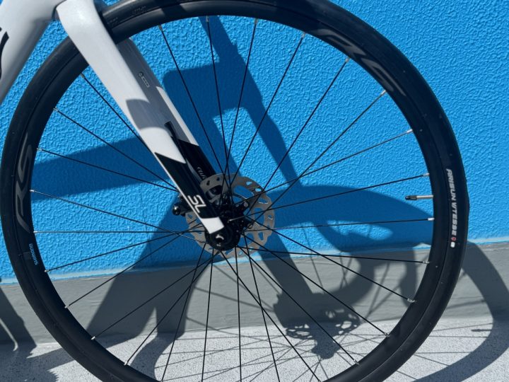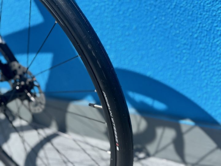 タイヤは太過ぎず細過ぎず700×28c! すごいスリックです。F1のタイヤみたいに溝がなにもありません。良さそう!