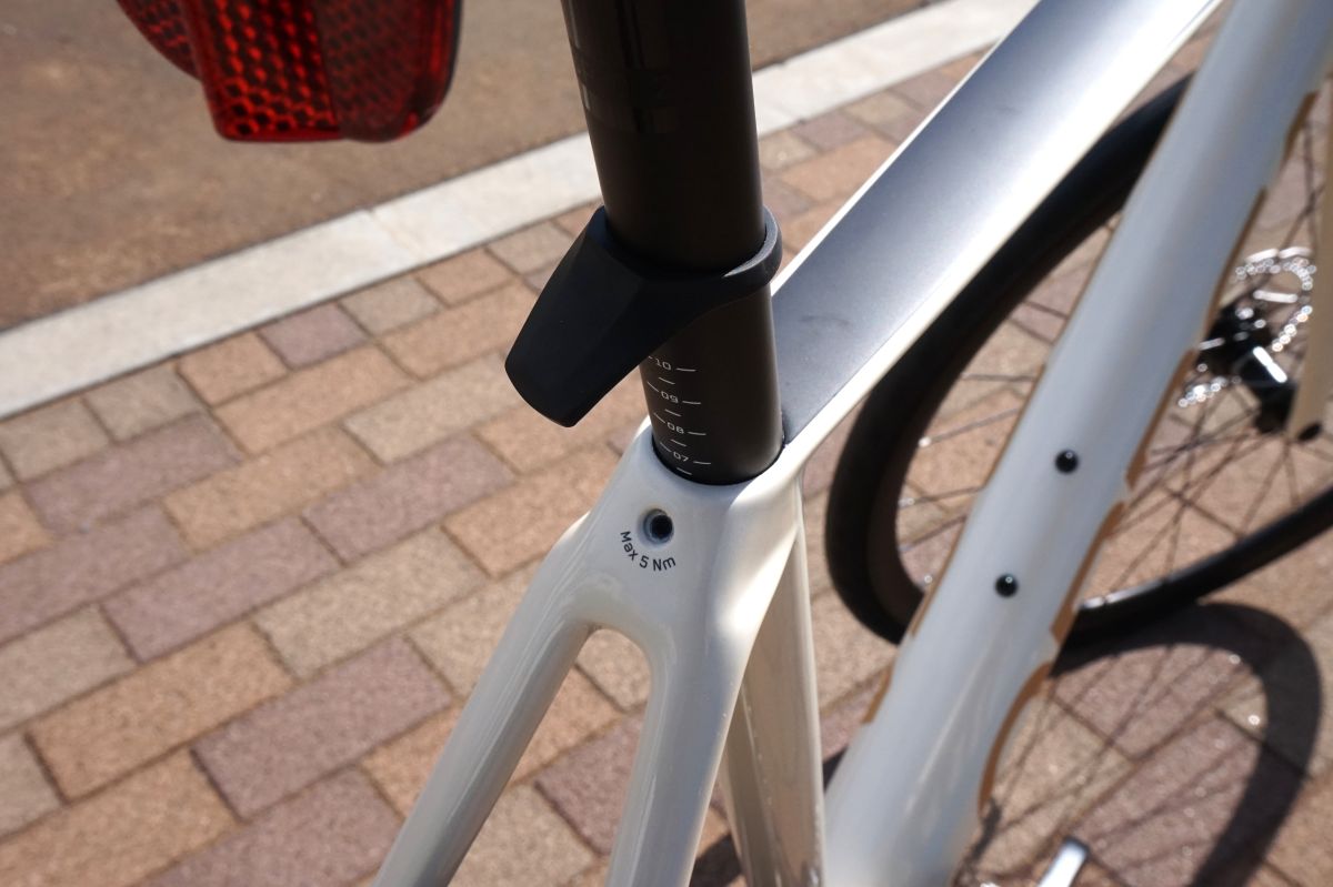 ゴムカバーをずらすと、シートポストの後ろ側にシートクランプのボルト穴が出てきます。最近はこのようなトップチューブとシートチューブの接合位置が一緒のデザインは珍しくなりましたね。