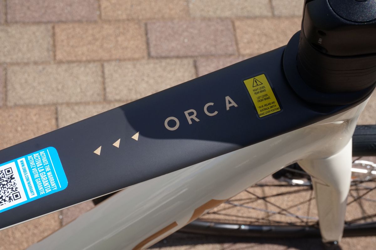 だいぶがっちりしていることが分かります。この造形をオルベアは『パワースパインデザイン』と呼んでいて、ハンドルとクランクからかかるライダーが入力するパワーを受け止めて逃がさず駆動力にするために、下部は高剛性となっています。