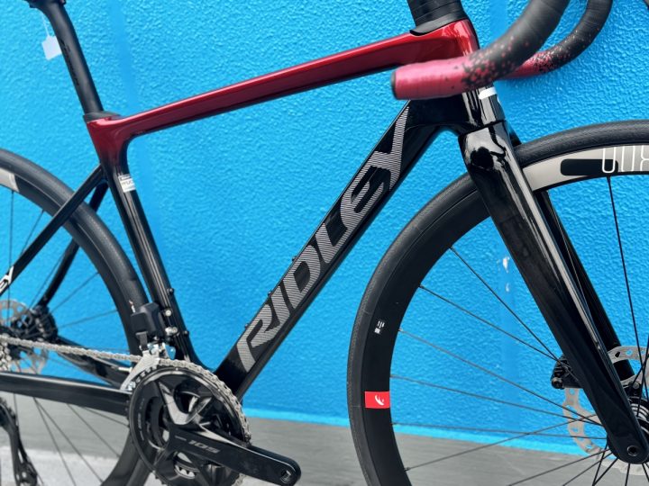 トップチューブだけダークなレッドで、すぐにグラデーションでブラックになりますが、カーボン地を活かしたような雰囲気のあるブラックです。高級感があって素敵!