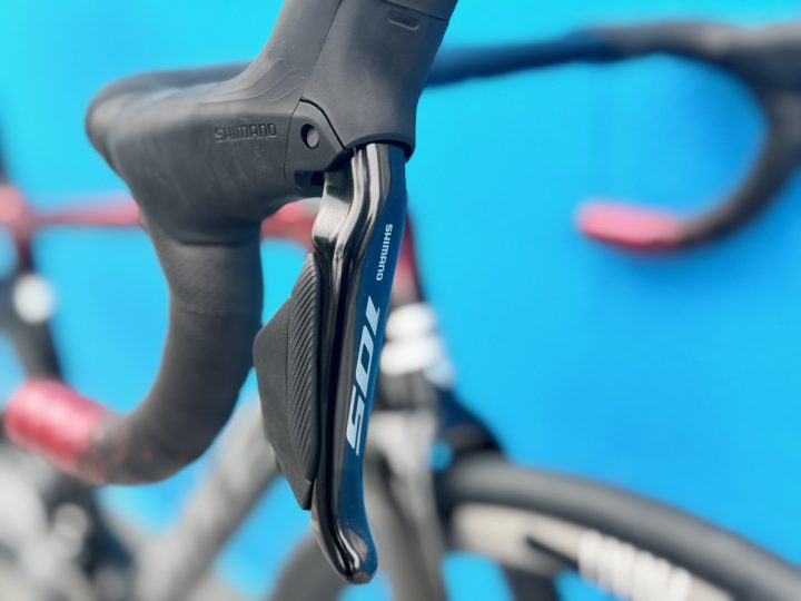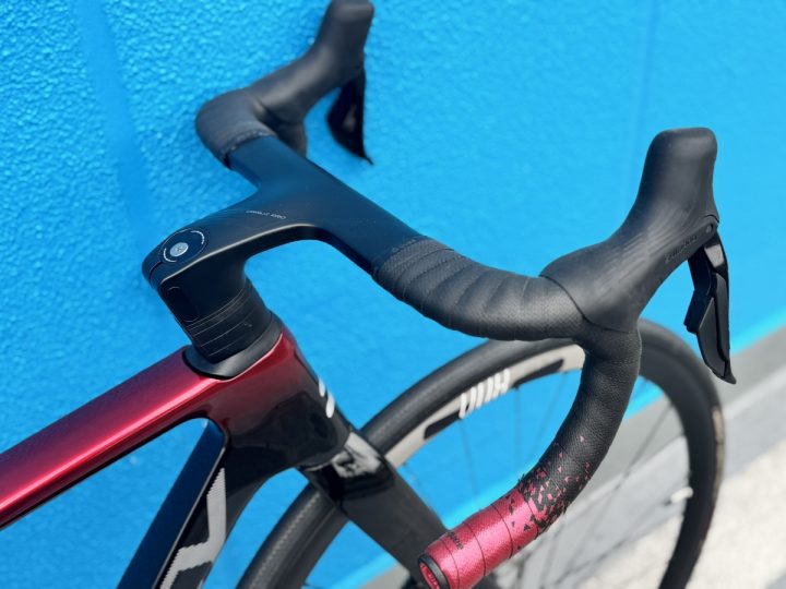ハンドルはステム一体型のワイヤー完全内装式のものです。ステム一体型のカーボンハンドルって、これだけで10万円ぐらいから、というところがあるので、付属してくるなんて有難いです。
