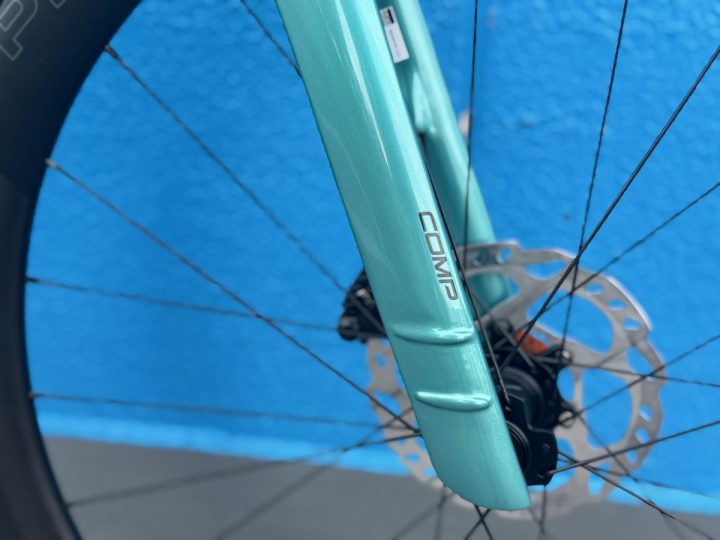 ダウンチューブがちょっと抉れてフロントタイヤとの隙間を取ってますが、余計な気流がおこらないように隙間が狭いです。