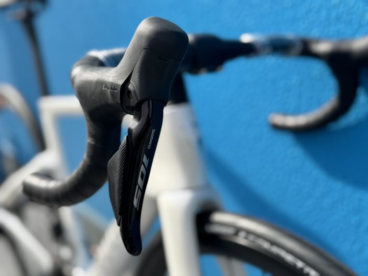ハンドル周りもリニューアルしました。ちょっと上ハンの幅が狭くなってだいぶハの字になっている感じがします。計ってみると上(ブラケット部分)が350mmで、下が400mmでした。最近の流行りです。