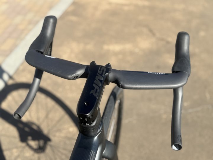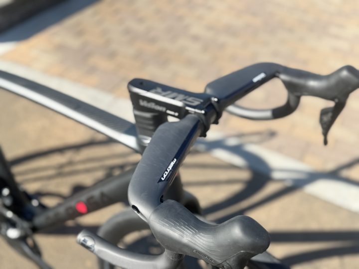 超軽量のカーボンハンドルですが、結構エアロ形状です。VISIONのハンドルにVISIONのステムですから間違いない組合せです。ワイヤー類は完全フル内装なので超スッキリです。ちなみに購入時にハンドル幅とステム長を選択できるようになってます。