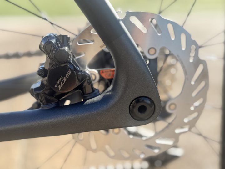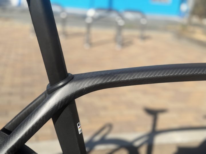 微妙にガンメタっぽいステルスブラックというカッコいいカラーですが、よく見ると、トップチューブからシートステーにかけて(弓なりの部分)はカーボンの地を活かしたデザインになってます。