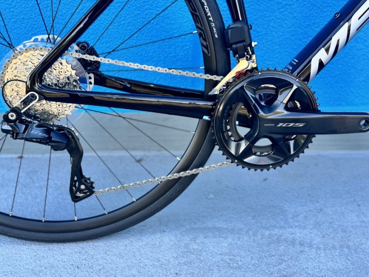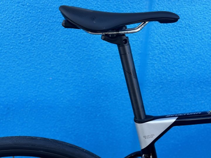 シートポストはメリダカーボン! 軽いわけです。車重量は8.4㎏(実測)。