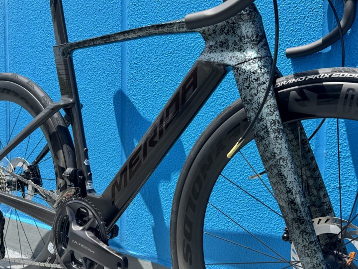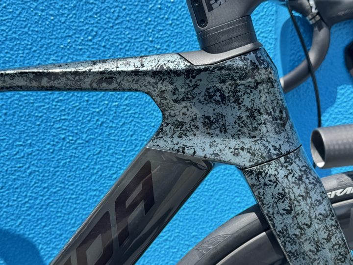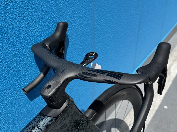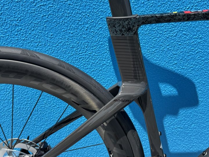このフレーム、フォークに使用されているカーボン『CF5 V』は、選手が乗っているものと同じものです。一新されたデザインは全体としてシャープになった印象で、洗練されてカッコいい感じですが、ただカッコよくなっただけではなく、空力性能も更に上がってます。