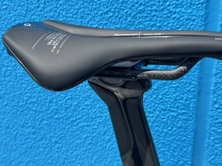 サドルは選手たち御用達、Prologo Nago R4 PAS Nack! 軽量カーボンレールの138g! エラストマー仕様のピラーもリニューアルされて、よりよくなってる感じです。