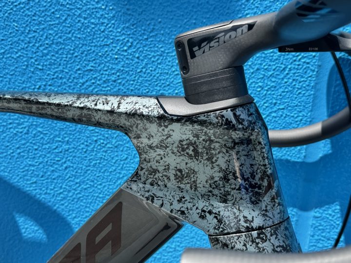 ステム一体型のカーボンハンドルはVision Metron 5D ACR EVO carbon! 仮組状態なのでブレーキホースがびよーんてなってますが、フル内装なので一ミリも露出しません。超スッキリです。
