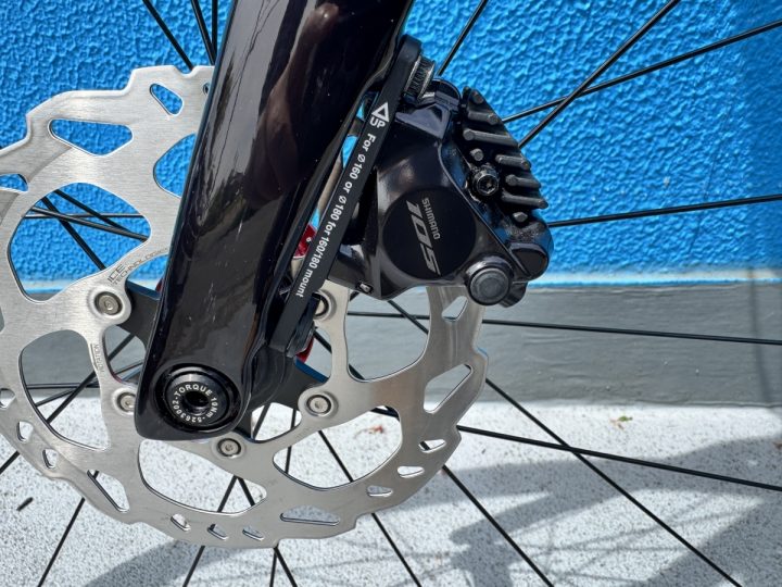 フロントフォークはカーボンです。グラデーションがきれいですよね。