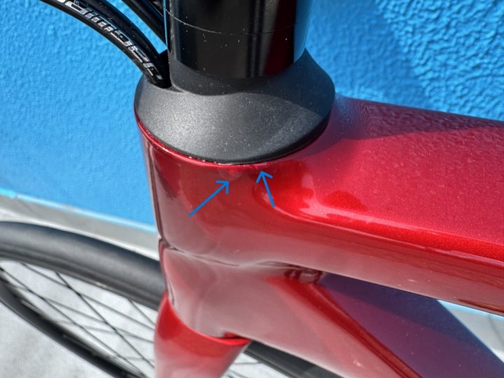 ちなみに塗装割れしていたのはヘッドチューブの上面の縁の部分です。写真だとほぼ分からないです。