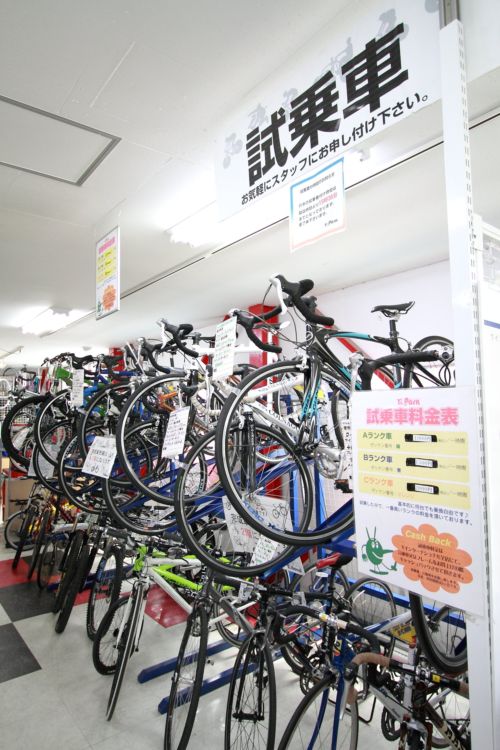 府中多摩川店には、試乗車のご用意がございます。常備しておりますブランドは、キャノンデール、トレック、ジャイアント、ジオス、アンタレス…etc ジャンルは、ロードバイク、マウンテンバイク、クロスバイク、小径車、フォールディングバイクなどほとんどの車種をご用意。サイズに迷われている場合なども、実車に跨って試して頂くことができます。