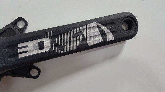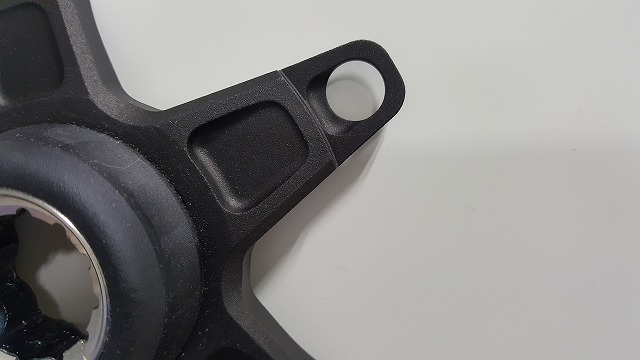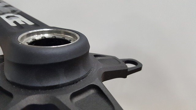 強靭な鍛造アルミニウムから削り出されたクランクアームには軽量化のため3本のドリルホールが開けられています。