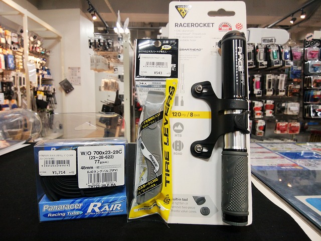 画像左から・チューブ・タイヤレバー・携帯ポンプ