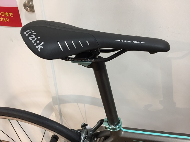 シートピラーはカーボン、サドルも特別カラーのfi’zi:kのANTARES。
