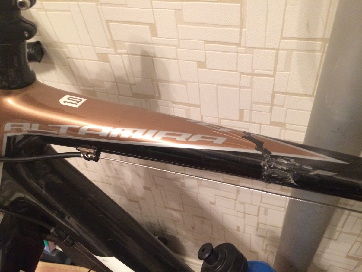 突然ですが先日、不慮の事故で愛車のFUJI アルタミラちゃんのトップチューブが無残な姿に。。。