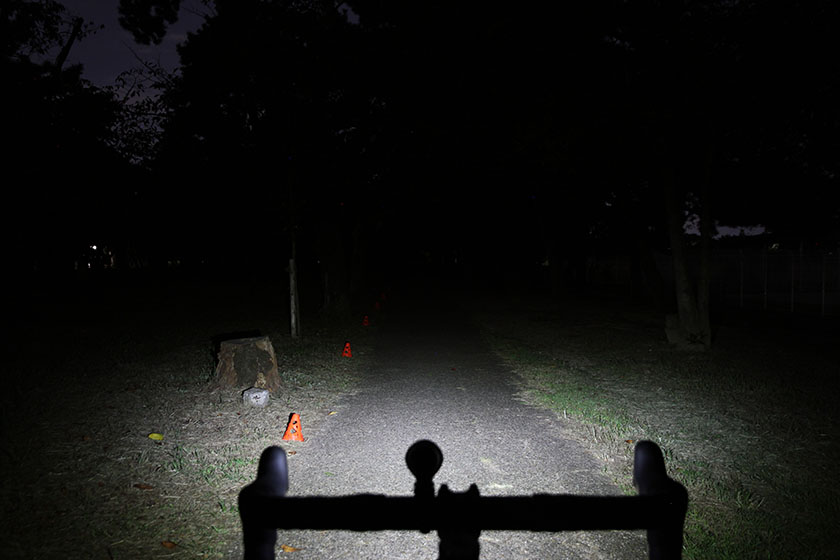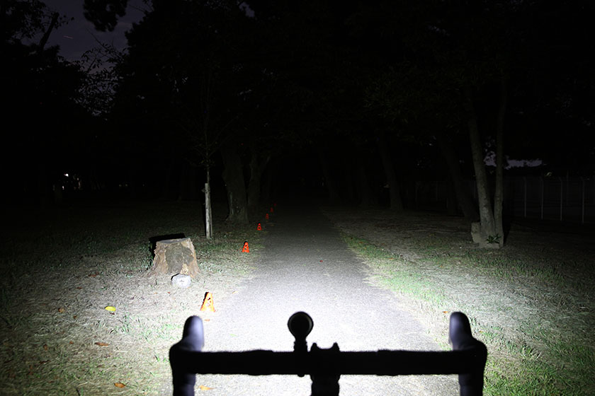 200ルーメンのLOWモードだとこのくらい。本気の真っ暗だと800ルーメンのHIGHモードでないと視界に映ったものがすぐ自分の目の前に迫ってくることになります。