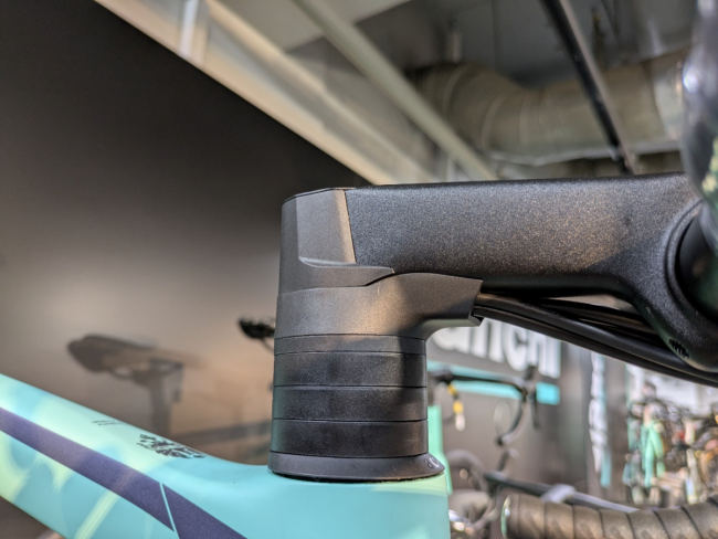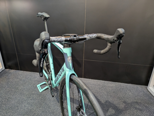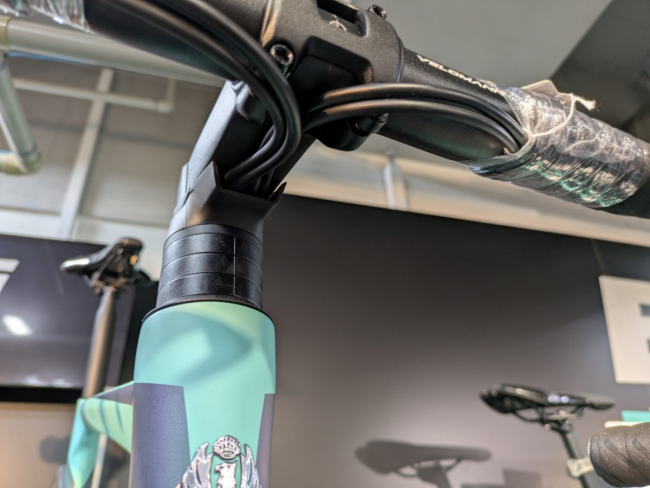 ハンドル、ステムは一体型ではありませんが、ケーブル類はステム下でまとめられフレーム内部を通っているので露出が少なく、空力への影響も最小限に抑えられているでしょう。