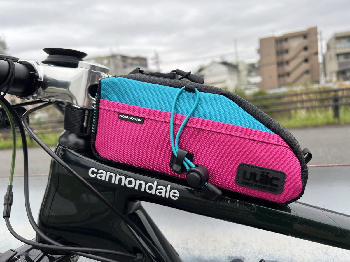 パッドの交換ついでにいつも使っているROUTE WERKSのハンドルバーバッグからULACのトップチューブバッグに付け替えしてみました。 重量 684g(マウント含む)から130gになったのでハンドル周りの取り回しが楽に、パラシュート並みの空気抵抗が無くなりました(体感)。ULACのバッグ類はカラフルでデザイン性に富んでいるのにお値段3,520円(税込)と人気ブランドのバッグの半額以下ということで当店でも入荷するとちょこちょこ売れているアイテムです。