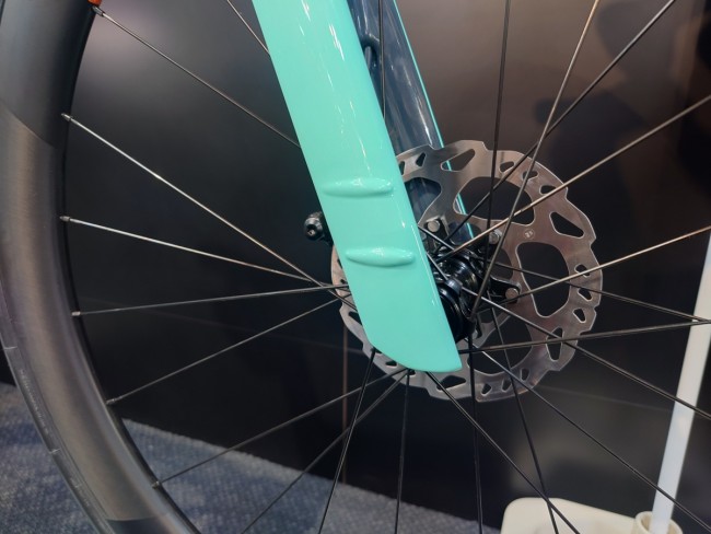 リアホイールとの隙間を極力までなくしたシートステー、ヘッドチューブにエアディフレクターが無い分よりボリューミーに、フォークコラムはオーバーサイズになりフォーク重量は上位モデルよりも軽量になっています。