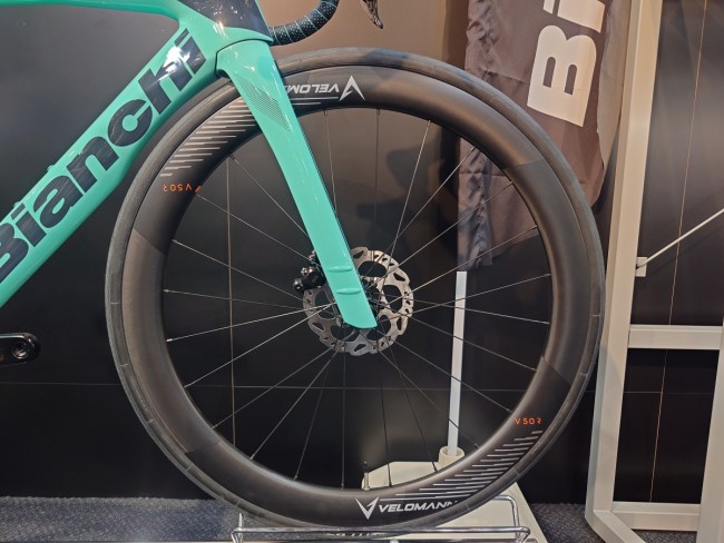 ホイールはVELOMANN CARBON 50mm。リム内幅21㎜でチューブレスレディ対応、前後セットで1630gと軽量はカーボンホイールがアッセンブルされています。