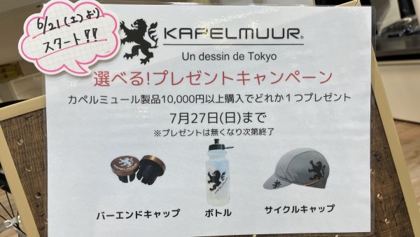 6/21~7/27までの期間限定で、カペルミュール製品を10,000円以上お買い上げいただいた方に、バーエンドキャップ、ボトル、サイクルキャップのどれか一つをプレゼントしております!