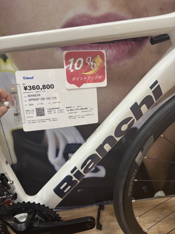 こんにちは!いつもワイズロード福岡天神店のブログをご覧いただきありがとうございます。天神店の辻と申します。BIANCHIカーボンバイクをお探しの方に朗報です。ワイズロードクラブ会員様限定で対象の自転車を購入時、税抜価格の10%分のポイント付与されます。(お支払い方法はといません。)今回紹介する自転車はBIANCHIのSPRINT DISC(カーボンバイク)になります。