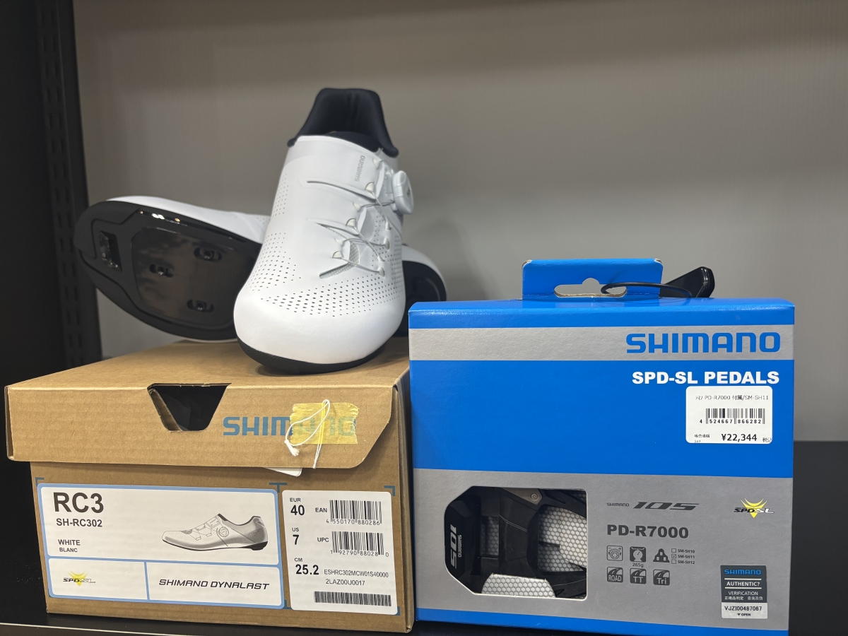 カーボンバイクなのでビンディングペダル、ビンディングシューズを履いて乗りたいと思っています。今回はSHIMANOのRC3シューズと105のSPD-SLペダルを選択しました。