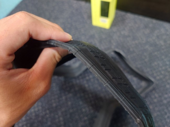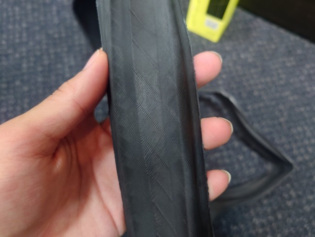 触るだけで「耐パンク性能と耐久性を重視したロードタイヤ」のコンセプトがひしひしと伝わってきます。