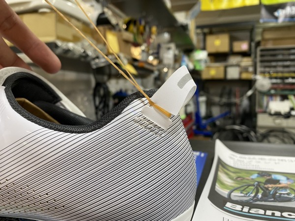 トライアスロンではスイムからバイクの切り替わり(T1)の時の為に、シューズもといクランクを⇧の画像のように輪ゴムで固定しておくことが多いのですが、その輪ゴムがずれにくいよう、ヒールループに⇩のように切り欠きがあるんです。「さすがシマノ、よく考えてるな」と思いましたね~。