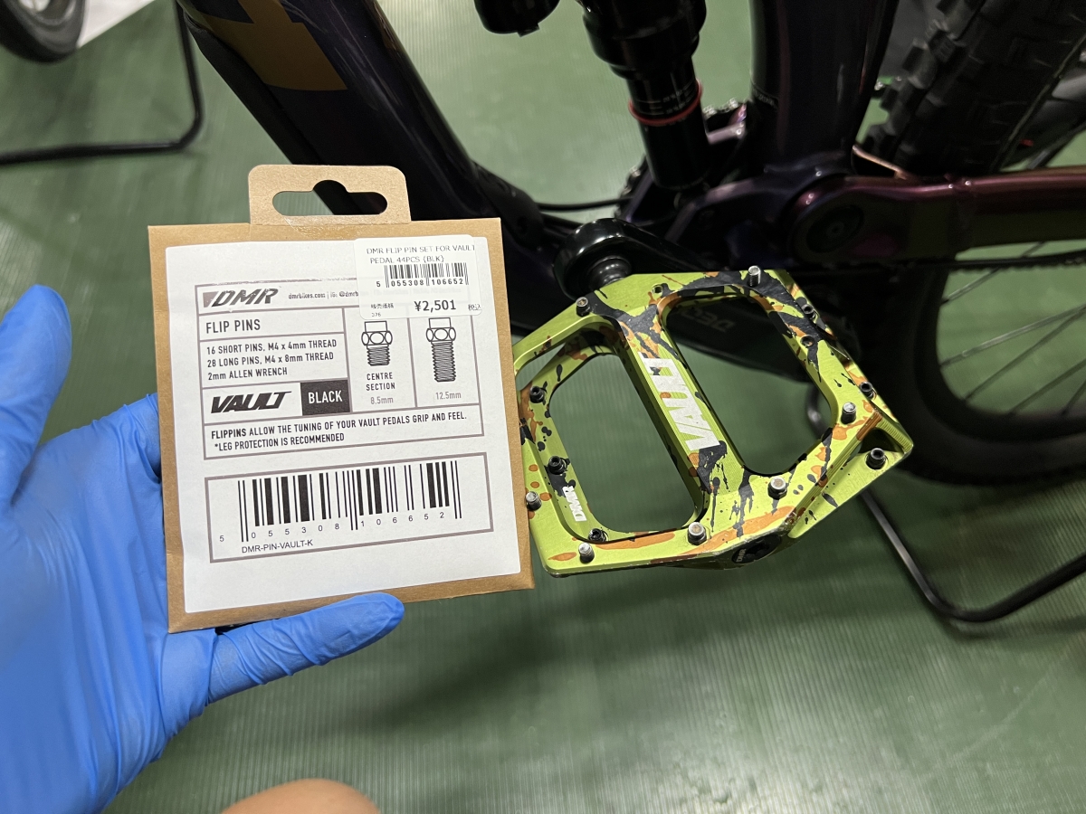 今回は調子に乗ってこまごまパーツを購入しています。先ずはこちらDMRのピン。定期的に増し締めを怠ったためかいくつか欠落していたので予備も含めてパックで購入。お値段も2,501円と良心的です。錆びてきた、刺さりが悪い、などで交換しても良いですし、カラーラインナップもあるので違うカラーを購入してドレスアップも良しです。