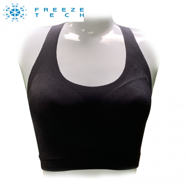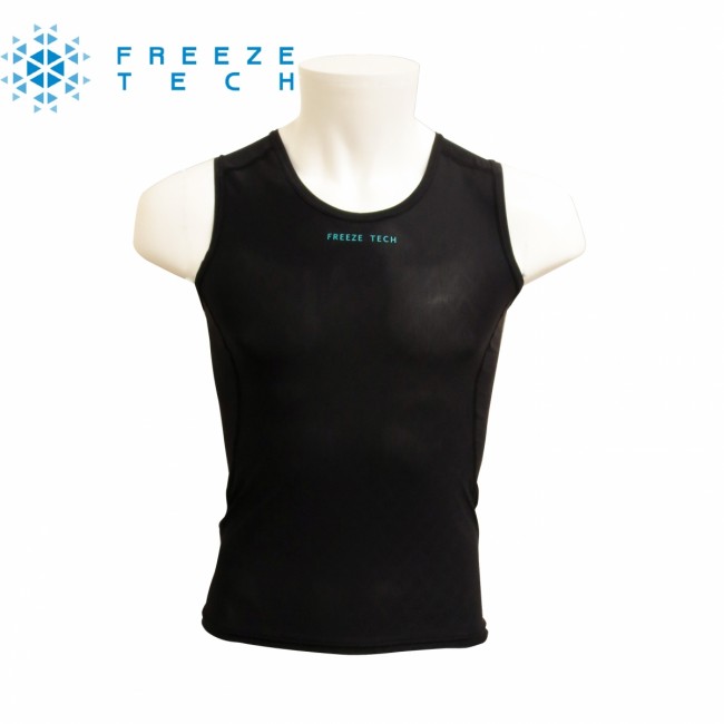 FREEZE TECHは接触冷感生地に加え、裏地全面にエリスリトール、キシリトールを含有した特殊プリントを施しています。 この”特殊冷感プリント”で処理した繊維が、人の皮膚から発生する水分(汗)を吸収すると、その吸熱特性により繊維の温度が下がり、冷感を付与します。