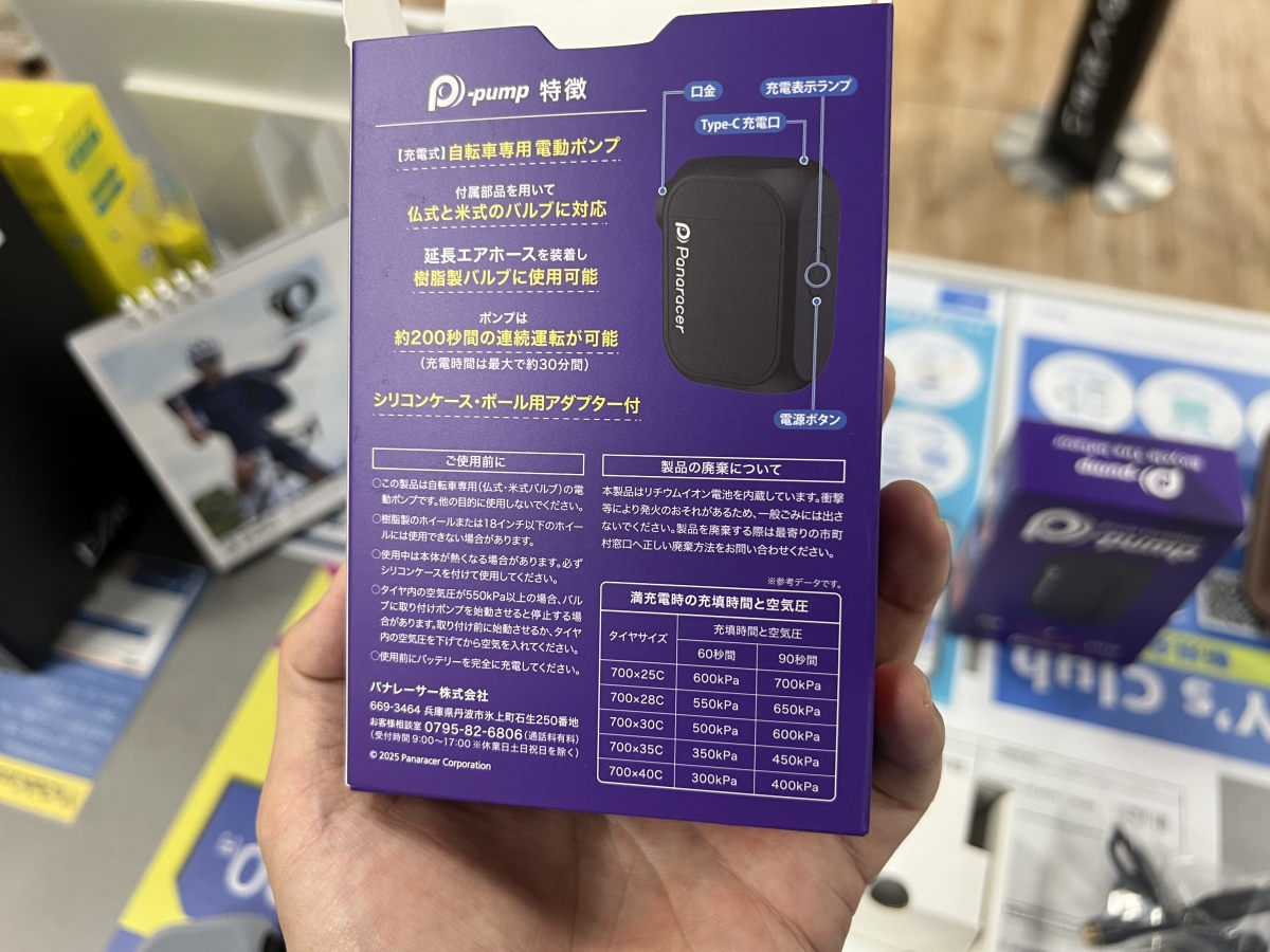 パナレーサーから電動ポンプが遂に発売!モニターがないタイプなので充填時間でおおよその気圧を把握する仕様となります。