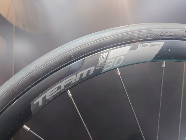 ホイールはVISIONのTEAM30。重量はペア1888gと軽量ではありませんが、30㎜ハイトでチューブレスレディ対応なので完成車付属ホイールとしては優秀です。
