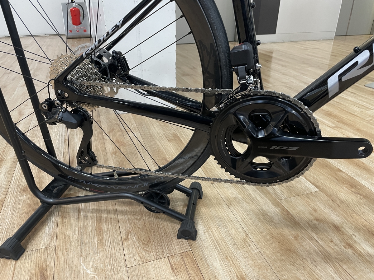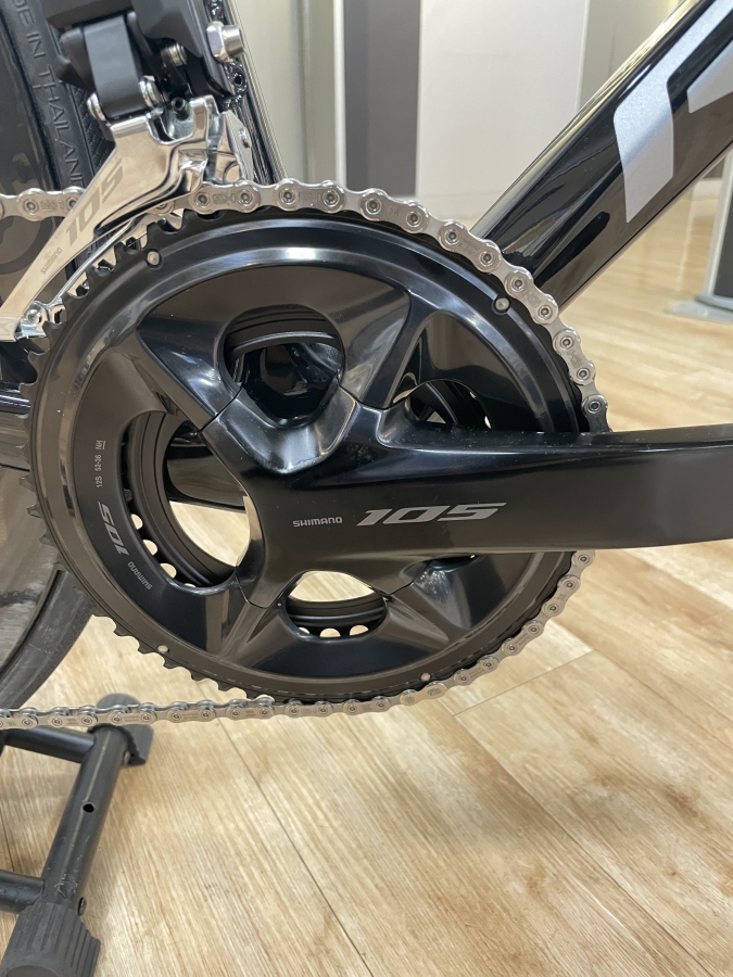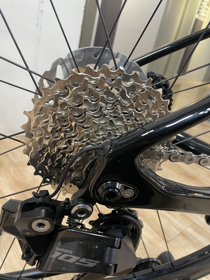 コンポーネントは105Di2です。ハイエンドモデルと同等の変速レンジとワンタップでスパスパと変速が決まる快適性があります。