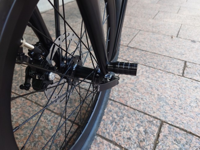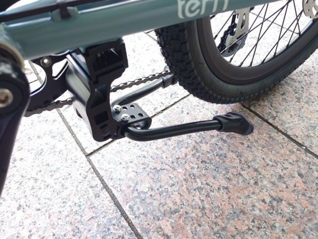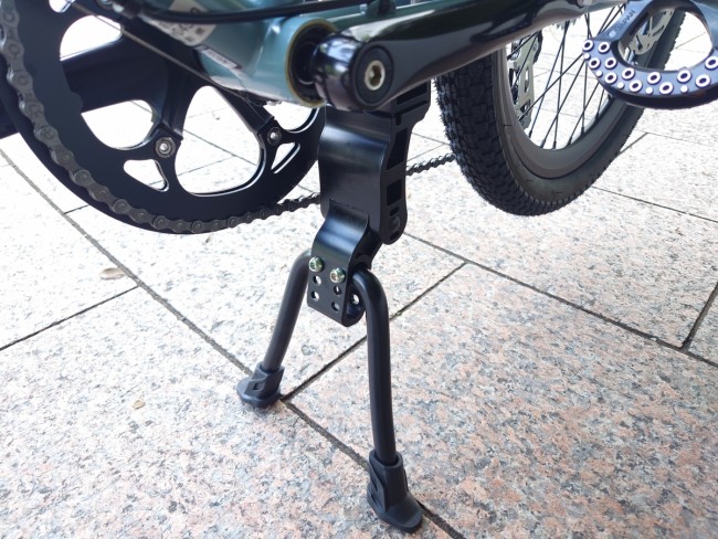 チェーンとの干渉を防ぐためのアジャスターが付いており、こちらも問題なく取り付け可能!駐輪時の安定感UPならダブルレッグおすすめです!