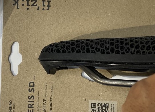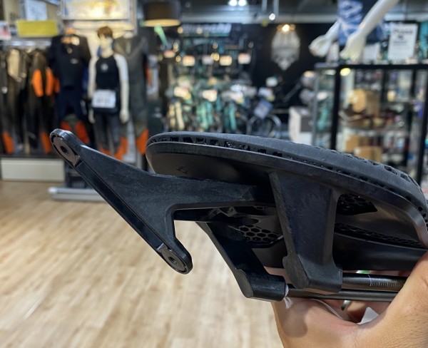 とのこと。実際に触ってみると、「これホントに同じサドルなの!?」と思ってしまうくらいに場所ごとにパッドの硬さが異なっていて、それぞれの場所の意味(ノーズはエアロポジション時の支え、後端は骨盤安定&踏み込み補助など…)を研究して作られているんだなあと感嘆させられました。