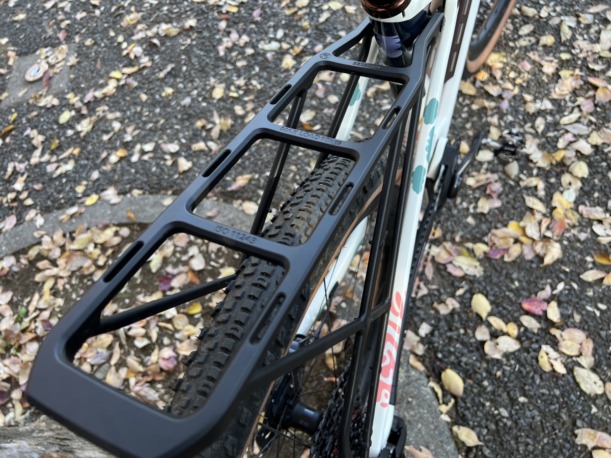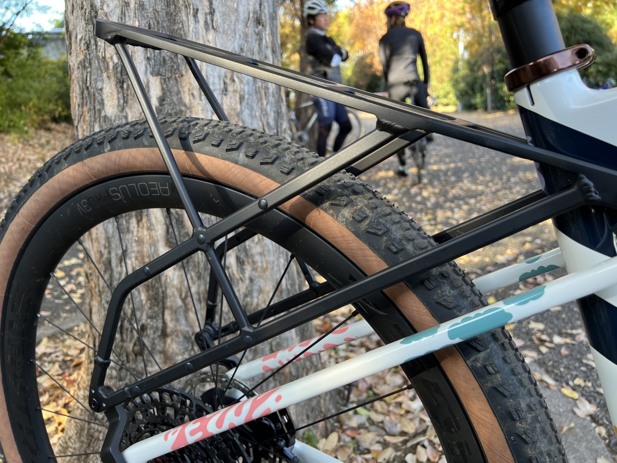 ドロッパーのインナーチューブにストラップを結んでサドルバッグを使っている猛者の方もいますが、TREKのCheckOUTなら専用設計のリアラックが付属するのでバイクパッキング時はリアラックにドライバッグが搭載可能です。