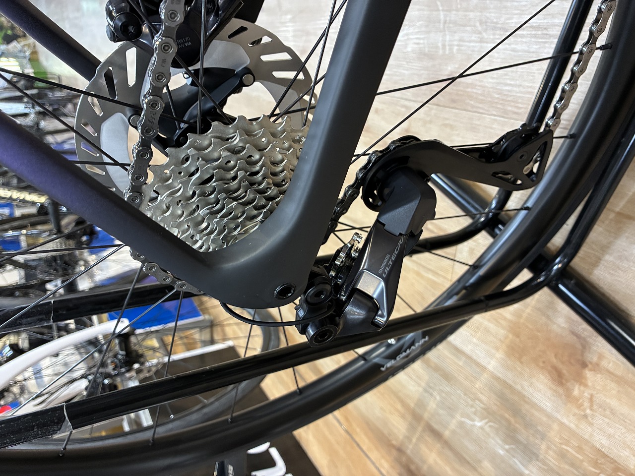 ホイールとサドルはVELOMANN製で、33mmと絶妙なハイトのカーボンホイールにカーボンレール仕様のサドル採用とカーボン尽くし。