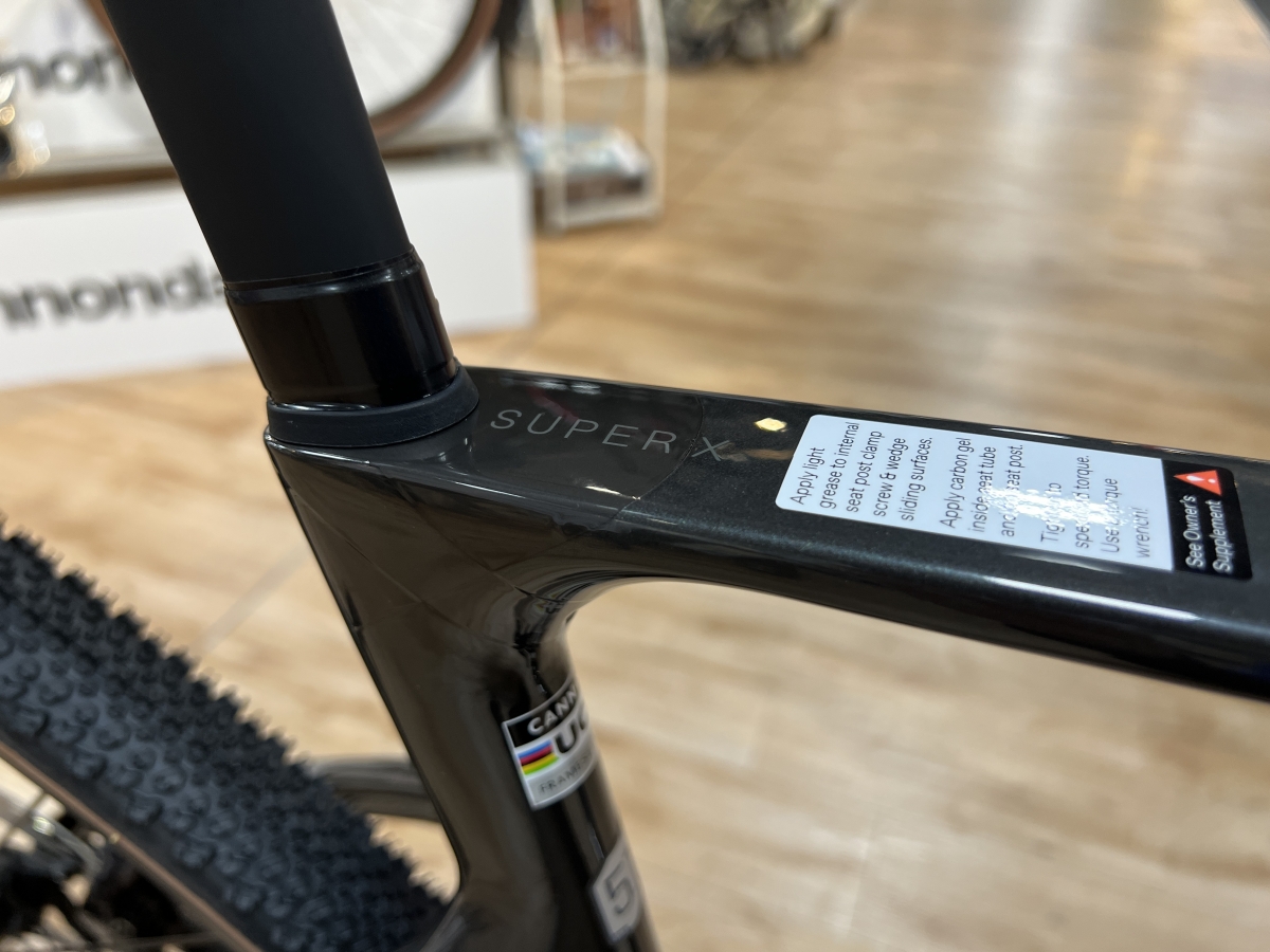 Super XはSupersix Evoのテクノロジーを受け継いだのでエアロで速い流線形のフレーム形状はもちろんですが、ジオメトリーにも現代的な変化を施しています。ヘッドアングルを寝かせ、フォークオフセットを通常より長い55mmに設定することでフロントから刺さって転んだり、バランスを崩すことの無いようにしています。細かいライン変更はトレイル値が短いためロードバイクのような細かい操作も得意としています。タイヤ幅はフロント48mm、リア51mmまでカスタム可能なので太いタイヤをはかせてグラベルを走ったり、33mmのタイヤでシクロクロスに参加したり活用の幅が広い車体です。