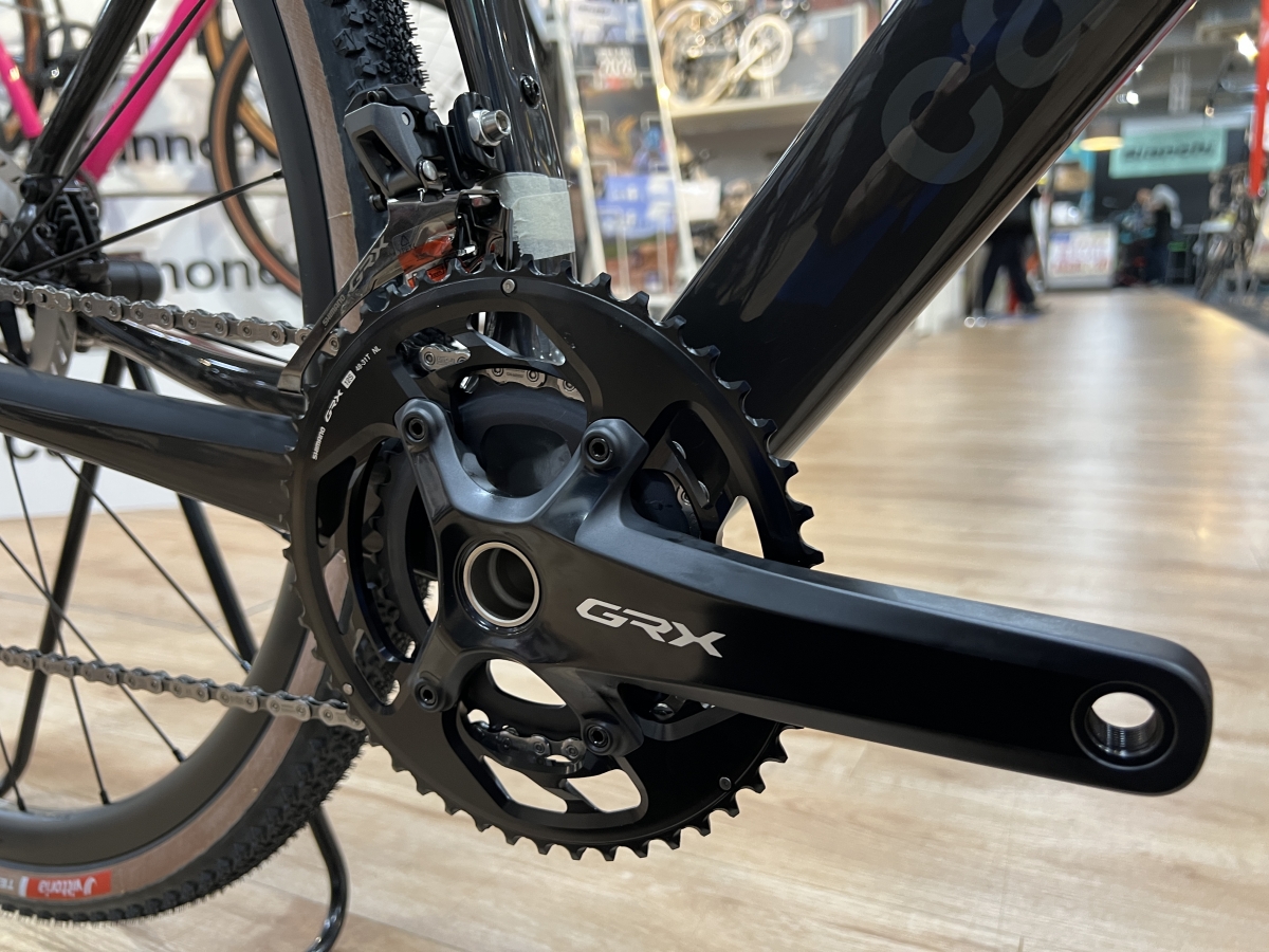 レース用途のフレームだけあって完成車に採用されているコンポはフロントダブルです。フロントシングルだと下りでトップ側が結構足りないのでコチラのギア構成だとロードバイクと同じような感覚でギアチェンジが可能です。勿論剛脚の方も安心です。クランクもRX820なので見た目もバッチリカッコイイです。